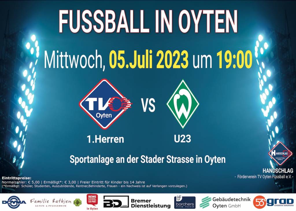 Am kommenden Mittwoch, 05.07.2023 empfängt das Team von Jan Fitschen den Meisterschaftfavoriten der Bremenliga 2023/2024, die U23 von Werder Bremen. Anstoß an der Stader Straße ist um 19.00 Uhr. Ein passender Termin, da der Mittwoch gleichzeitig der letzte Schultag vor den Sommerferien ist. Neben der Verlosung eines Original-Fussballs aus der 1.Bundesliga sorgt der Förderverein mit Speis und Trank für einen angemessenen Rahmen.