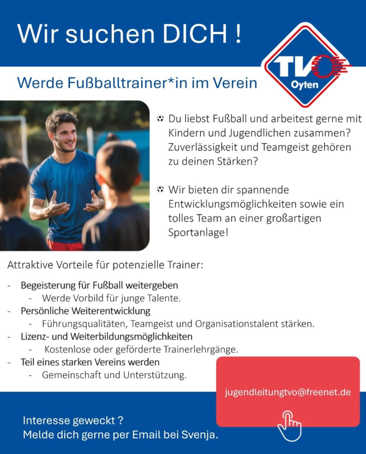 Du hast Bock Jugendtrainer*in beim TV Oyten zu werden und Kinder und Jugendliche auf ihrem Weg zu begleiten, zu fördern und zu coachen? Dann melde dich bei uns für mehr Informationen! 💙❤️